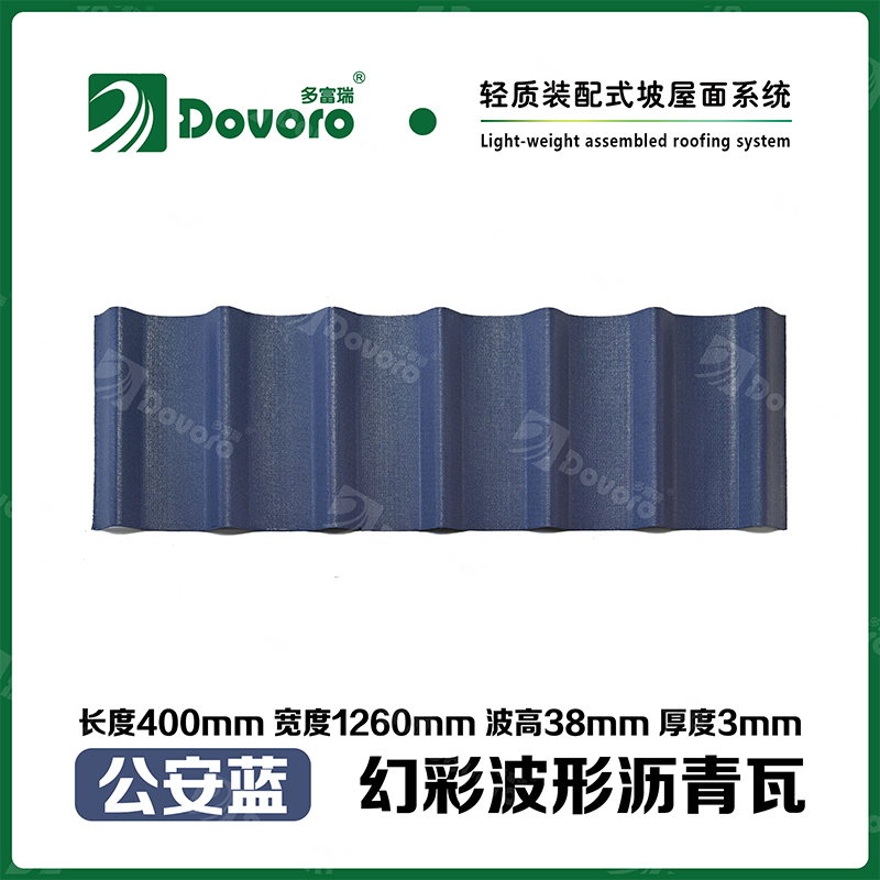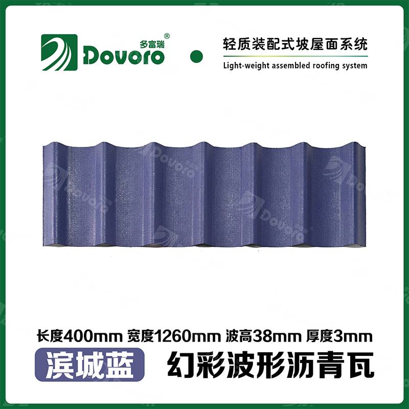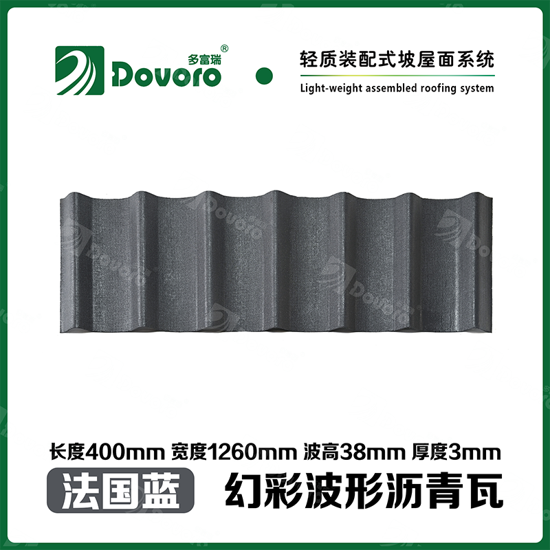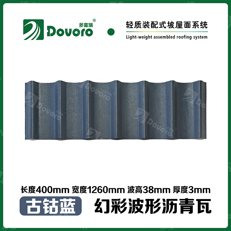 多富瑞幻彩波形沥青瓦是由矿植物纤维板经过整形后浸渍沥青而成,一次成型的基层板在高温下浸渍沥青,使瓦材整体性更加牢固;热固性树脂保证了瓦材的强度和刚度;进口原料配合先进的着色工艺确保颜色持久、混色喷涂工艺使瓦材外观高雅、色彩美观、立体质感。