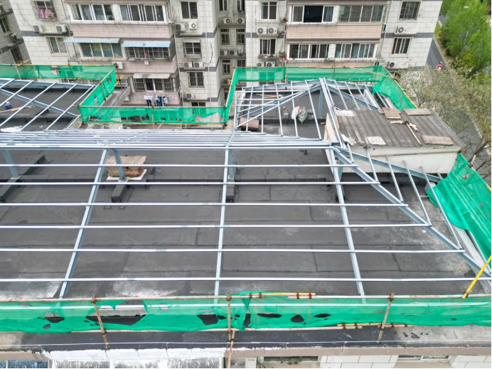“无锡月秀东园项目”采用单层波形沥青瓦的施工方案,将原先的平顶屋面清理后涂刷防水涂层,在平顶屋面上搭建坡屋面钢构,使用瓦钉将波形沥青瓦固定至钢檩条。